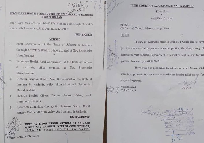 ہیلتھ ڈیپارٹمنٹ جہلم ویلی کے حالیہ اشتہار میں معذور کوٹہ رکھا ہی نہیں گیا عدالت نے فریقین کو نوٹس جاری کیا ہے کہ وہ 3 جون 2025 کو ریکارڈ سمیت عدالت پیش ہو کر وضاحت جواب دیں۔