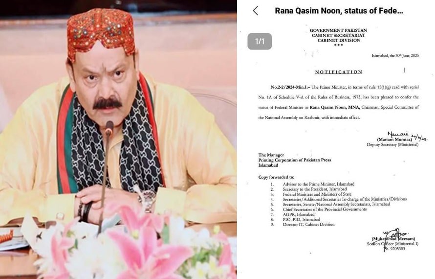 چیئرمین کشمیرکمیٹی رانا قاسم نون کو وفاقی وزیرکاعہدہ مل گیا،نوٹیفکیشن جاری