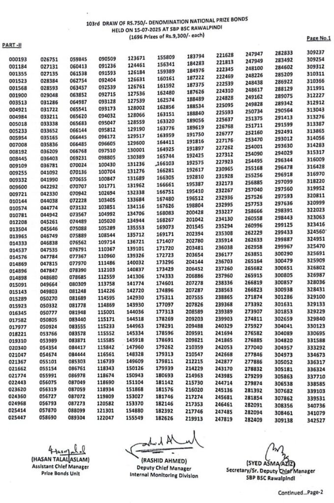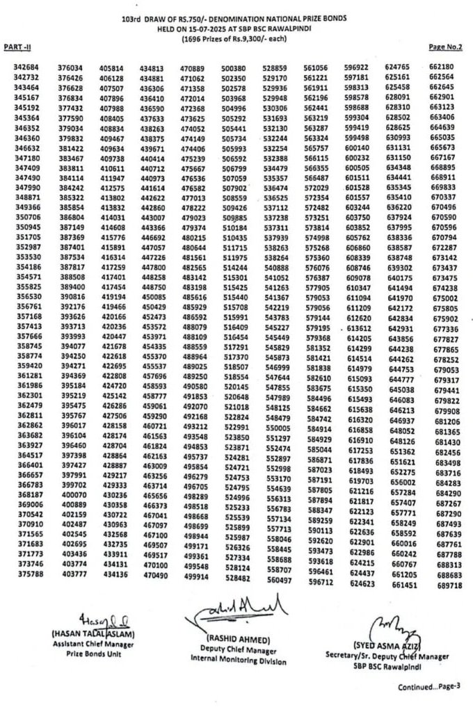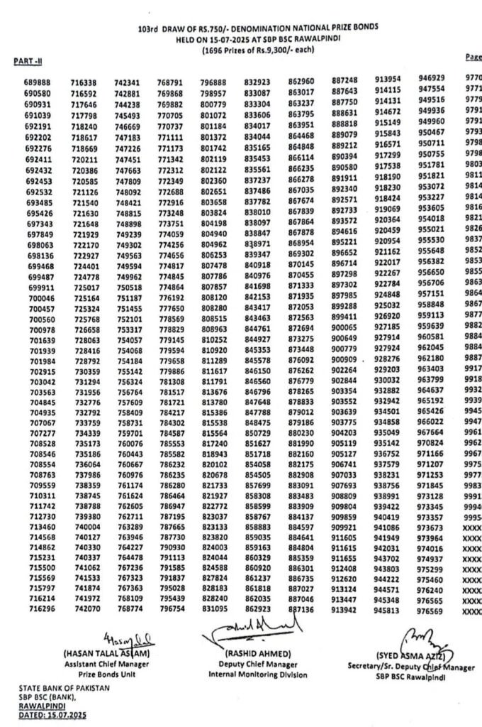 نتائج کے مطابق 750 مالیت کے پرائز بانڈ کی قرعہ اندازی کا پہلا انعام 953346 ہے۔ دوسرا انعام حاصل کرنے والوں کے نمبر 294897، 651248 اور 965105 ہیں۔
