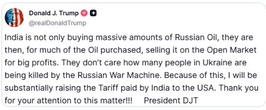 سوشل میڈیا پر جاری بیان میں ڈونلڈ ٹرمپ کا کہنا تھا کہ بھارت نہ صرف بڑی مقدار میں روسی تیل خرید رہا ہے بلکہ اسے فروخت کرکے منافع بھی کما رہا ہے۔