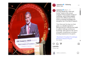 شاہی محل سے جاری بیان کے مطابق بادشاہ فلیپ نے یورپی سوسائٹی آف کارڈیالوجی کے سالانہ کانگریس میں خصوصی اجلاس “ہارٹ اینڈ سوسائٹی” میں شرکت کی۔ اس اجلاس میں دنیا بھر کے ماہرین امراض قلب شریک ہوئے۔ اپنے خطاب میں بادشاہ نے طبی ماہرین کی خدمات کو خراجِ تحسین پیش کیا اور کہا کہ قلبی صحت ایک عالمی چیلنج ہے جس کا حل اجتماعی علم اور تعاون سے ہی ممکن ہے۔ انہوں نے اس بات پر زور دیا کہ جب علم ترقی کے لیے بروئے کار آئے تو اس کی کوئی سرحد باقی نہیں رہتی۔