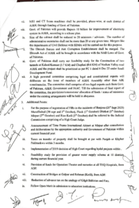 گلپور میں پل کی تعمیر،گلگت بلتستان اور فاٹا کی مشابہت پر ایڈوانس ٹیکس میں کمی۔تعلیمی اداروں میں داخلے میں اوپن میرٹ کی شرائط بھی معاہدے میں شامل ہیں۔