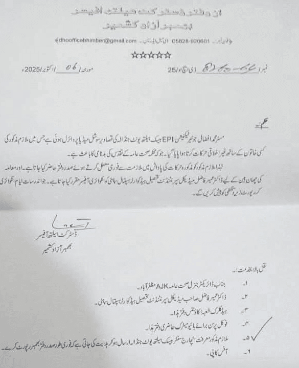 ڈی ایچ اوبھمبرنے نوٹس لیتے ہوئے جونیئر ٹیکنیشن بی ایچ یو جنڈالہ محمد افضال کو معطل کرتے ہوئے انکوائری افسر مقرر کرتے ہوئے 7دن میں رپورٹ طلب کر لی۔