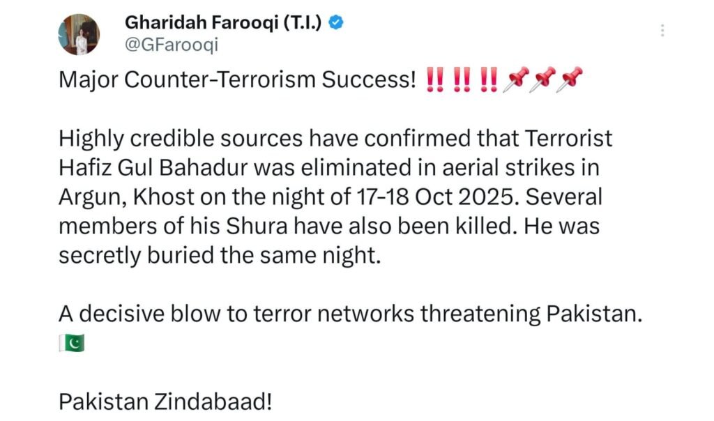 ایکس پر اپنی پوسٹ میںغریدہ فاروقی کا کہنا تھا کہ پاکستان نے انسداد دہشتگردی میں بڑی کامیابی حاصل کی ہے اورانتہائی معتبر ذرائع نے تصدیق کی ہے کہ 17-18 اکتوبر 2025 کی درمیانی شب ارغون خوست میں فضائی حملے میں دہشتگرد حافظ گل بہادر مارا گیا ہے۔