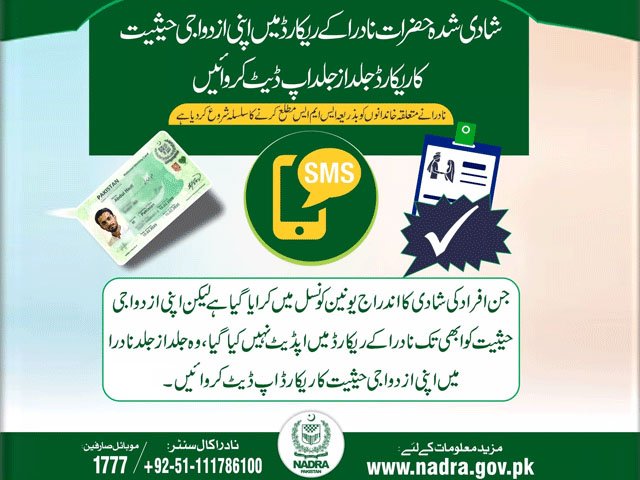 اس کے ساتھ ہی نادرا نے شہریوں کی سہولت کے لیے ایک ایس ایم ایس سروس بھی متعارف کرائی ہے تاکہ شادی شدہ افراد کو اس حوالے سے آگاہی فراہم کی جا سکے۔