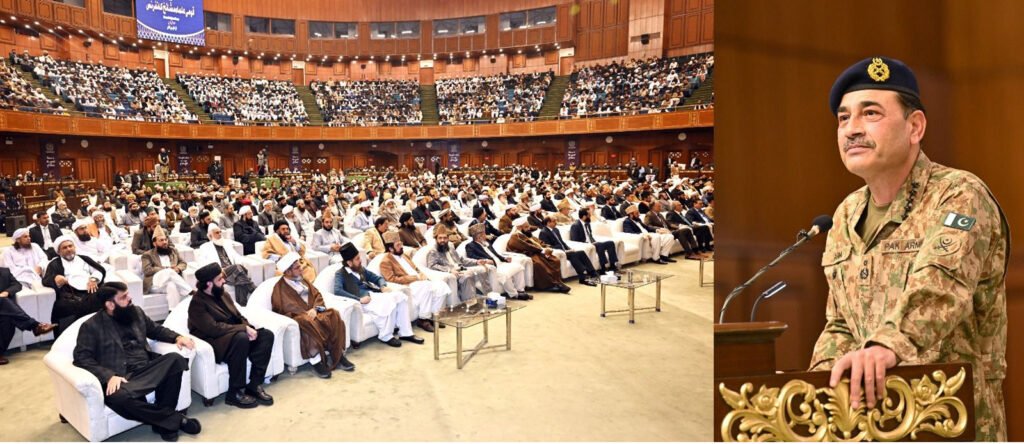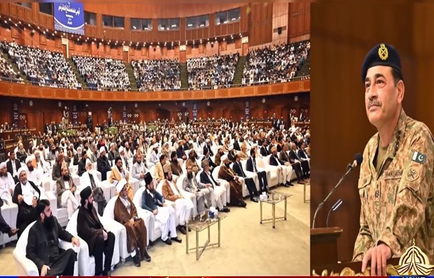 اسلام آباد(کشمیر ڈیجیٹل) آرمی چیف وفیلڈ مارشل، چیف آف ڈیفنس فورسز عاصم منیر نے قومی علماء ومشائخ کانفرنس سے خطاب کرتے ہوئے کہا کہ ہم دشمن کو چھپ کرنہیں للکار کر مارتے ہیں ۔