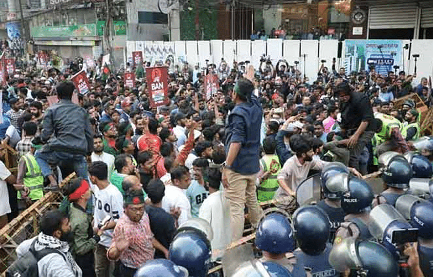 اس پر مظاہرین نے سڑک پر دھرنا دے دیا اور ‘دہلی ہو یا ڈھاکہ، پہلے ڈھاکہ’ اور ‘بھارتی بالادستی نامنظور’ جیسے نعرے لگائے۔ مظاہرین نے بھارتی اثر و رسوخ کے خلاف پلے کارڈز بھی اٹھا رکھے تھے۔