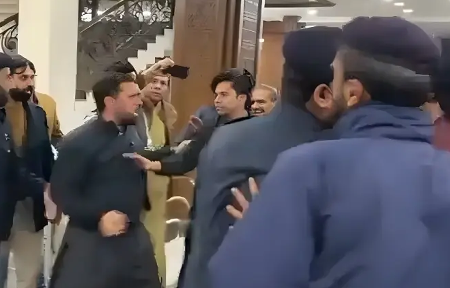 اسمبلی سکیورٹی نے سب کو تحمل سے شناخت کی گزارش کی جس پر قافلے نے گالم گلوچ اور دھکم پیل کی۔