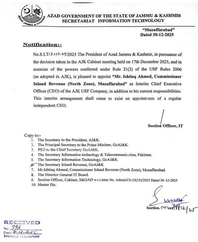 آزاد جموں وکشمیر یونیورسل سروس فنڈ کمپنی کے پہلے چیف ایگزیکٹو آفیسر محکمہ ان لینڈ ریونیو آزادکشمیر کے کمشنر مظفرآباد زون اشتیاق احمد مقرر کردیئے گئے۔