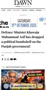 : ”Defence Minister Khawaja Muhammad Asif dropped a political bombshell on the Punjab Government۔ گرافکس کے ذریعے یہ تاثر دیا جا رہا تھا کہ وفاقی وزیر دفاع خواجہ محمد آصف نے پنجاب حکومت کے خلاف کوئی بڑا سیاسی بیان دیا ہے۔