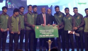 تقریب کے آغاز میں چیئرمین پی سی بی محسن نقوی نے رائزنگ اسٹار ایشیا کپ جیتنے والی ٹیم کو 9 کروڑ روپے کی انعامی رقم دی۔