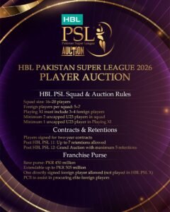 پی ایس ایل 2026 میں منتخب ہونے والے کھلاڑیوں کو دو سالہ کنٹریکٹس دیے جائیں گے۔ پی ایس ایل 11 کے بعد فرنچائزز سات کھلاڑیوں کو ریٹین کر سکیں گی، جبکہ پی ایس ایل 12 کے بعد ہونے والے گرینڈ آکشن میں زیادہ سے زیادہ پانچ کھلاڑی ریٹین کیے جا سکیں گے۔