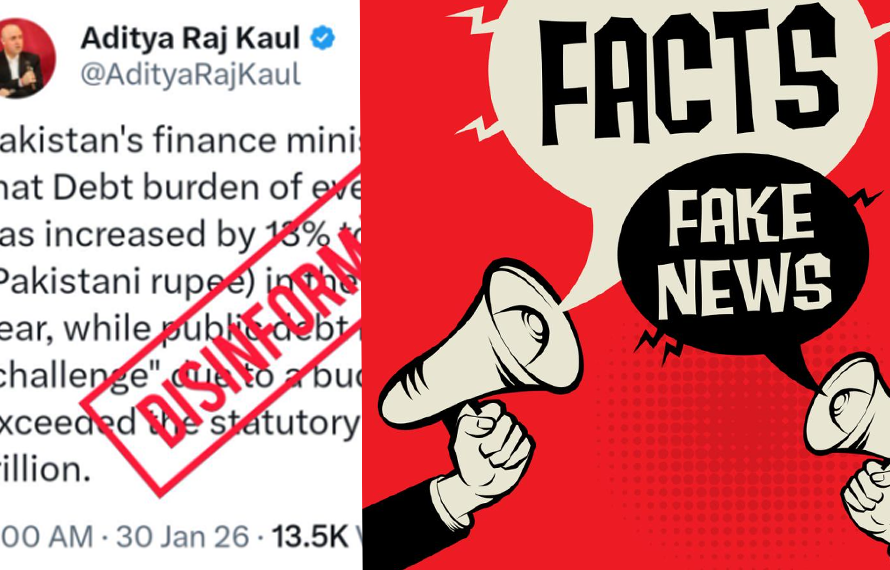فیکٹ چیک نے بھارت سے ہینڈل ہونے والے ایکس (X) اکاؤنٹ کی جانب سے پھیلائی جانے والی جھوٹی معلومات کی نشاندہی کی ہے جس میں یہ دعویٰ کیا جا رہا تھا کہ پاکستان میں ہر شہری پر 3 لاکھ 33 ہزار روپے قرض ہے۔ فیکٹ چیک رپورٹ کے مطابق یہ دعویٰ حقائق کے منافی، جعلی خبر اور بھارتی پروپیگنڈا ہے۔