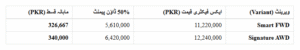 سگنیچرAWD ورینٹ: اس کی قیمت 12,240,000 روپے ہے، جس کی ڈاؤن پیمنٹ 6,420,000 روپے اور ماہانہ قسط 340,000 روپے مقرر کی گئی ہے۔
