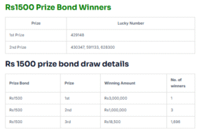 پہلا انعام: پرائز بانڈ نمبر 429148 نے 30 لاکھ (3,000,000) روپے کا پہلا انعام جیت لیا ہے۔
