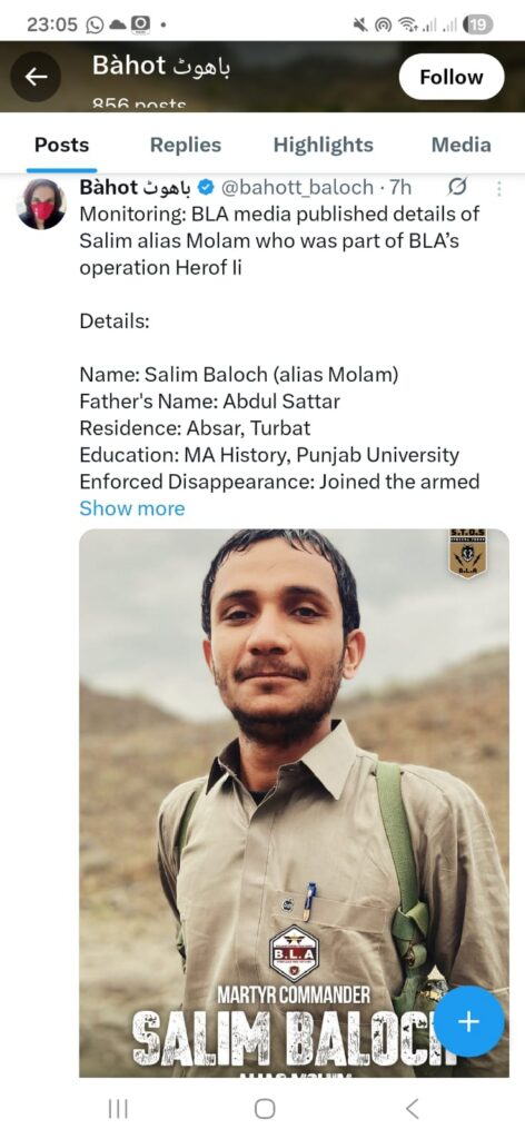 باہوت بلوچ کے اکائونٹ پر تصدیق کی گئی ہے کہ سلیم بلوچ نے تربت میں پاک فوج سے لڑائی کی اور جہنم واصل ہوا اور یہ نوجوان پنجاب یونیورسٹی سے پڑھ کر گیا ۔