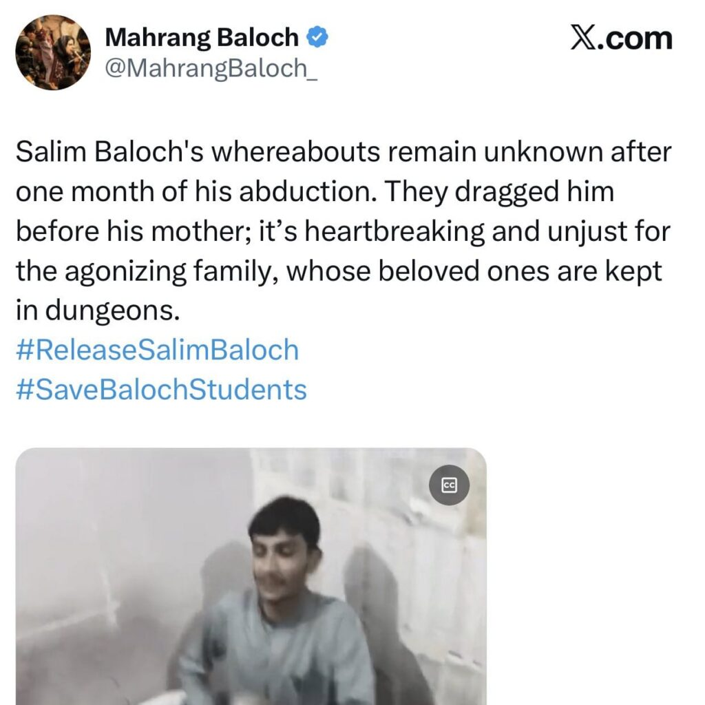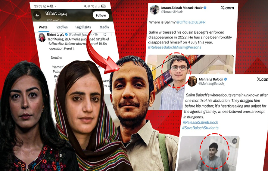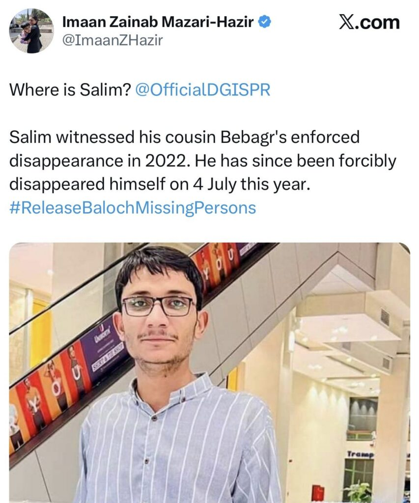 ایمان حاضر مزاری اور ماہ رنگ بلوچ ماضی قریب میں اسی سلیم بلوچ کو مسنگ پرسن قرار دے کر بازیابی کے لیے شور شرابہ مچاتی رہی ہیں۔