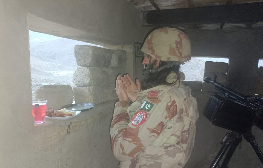 ایف سی نارتھ کا سپاہی افطار کے وقت سرحد کی حفاظت کر رہا ہے۔افطار سے قبل کا یہ منظر جذباتی اور دل کو چھو لینے والا قرار دیا جا رہا ہے۔