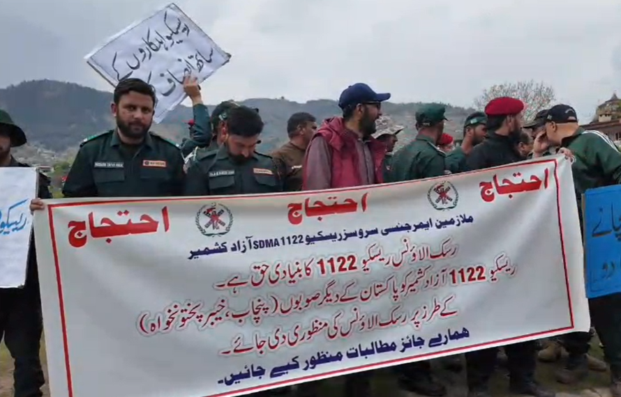 مظفرآباد : دارالحکومت مظفرآباد میں ریسکیو 1122 کے ملازمین نے رسک الاؤنس کی عدم ادائیگی کے خلاف پریس کلب مظفرآباد کے سامنے احتجاجی دھرنا دے دیا ہے۔ مظاہرین کا کہنا ہے کہ جب تک ان کے مطالبات منظور نہیں کیے جاتے، ان کا یہ احتجاج مسلسل جاری رہے گا۔