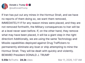 اس سے قبل امریکی صدر نے سوشل میڈیا پر بتایا کہ امریکی فورسز نے گزشتہ چند گھنٹوں میں سرنگیں بچھانے والی 10 کشتیوں اور جہازوں کو مکمل طور پر تباہ کر دیا ہے۔ دوسری جانب ٹروتھ سوشل پر جاری پیغام میں امریکی صدر ڈونلڈ ٹرمپ کا کہنا ہے کہ ایران نے بارودی سرنگیں بچھانے کی کوشش کی تو مزید کارروائیاں کریں گے۔ انہوں نے کہا کہ اگر مائنز بچھائی گئی ہیں تو انہیں فوری ہٹا دیا جائے ورنہ ایران کو خوفناک نتائج بھگتنا ہوں گے۔