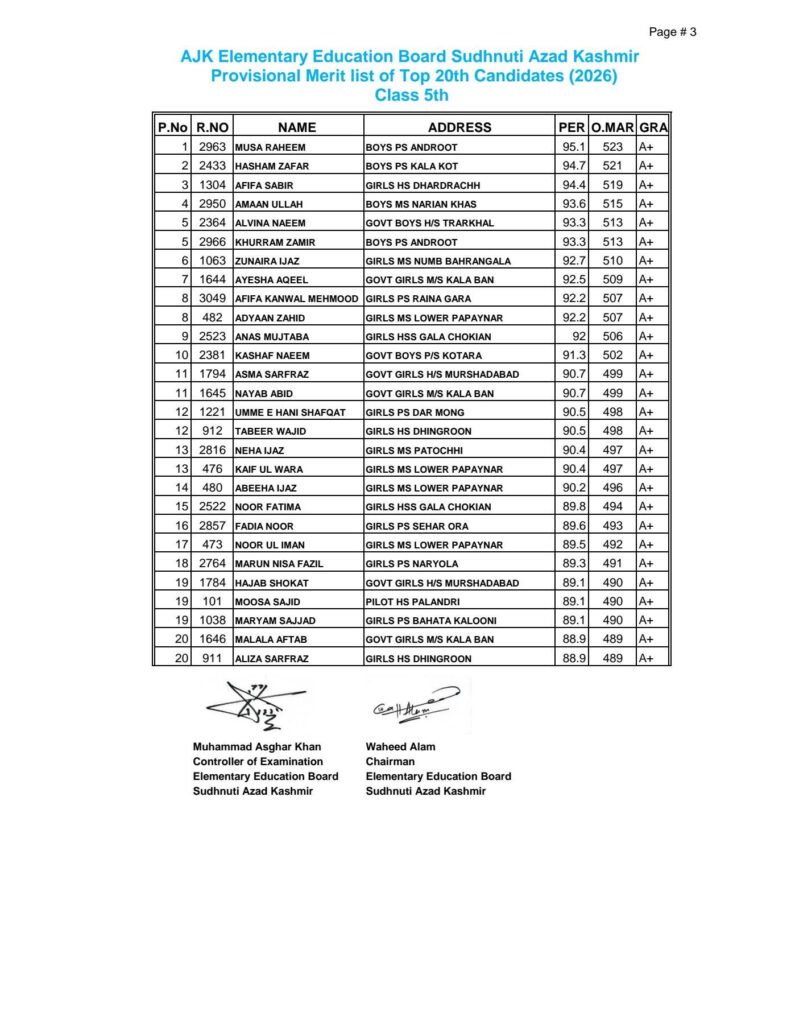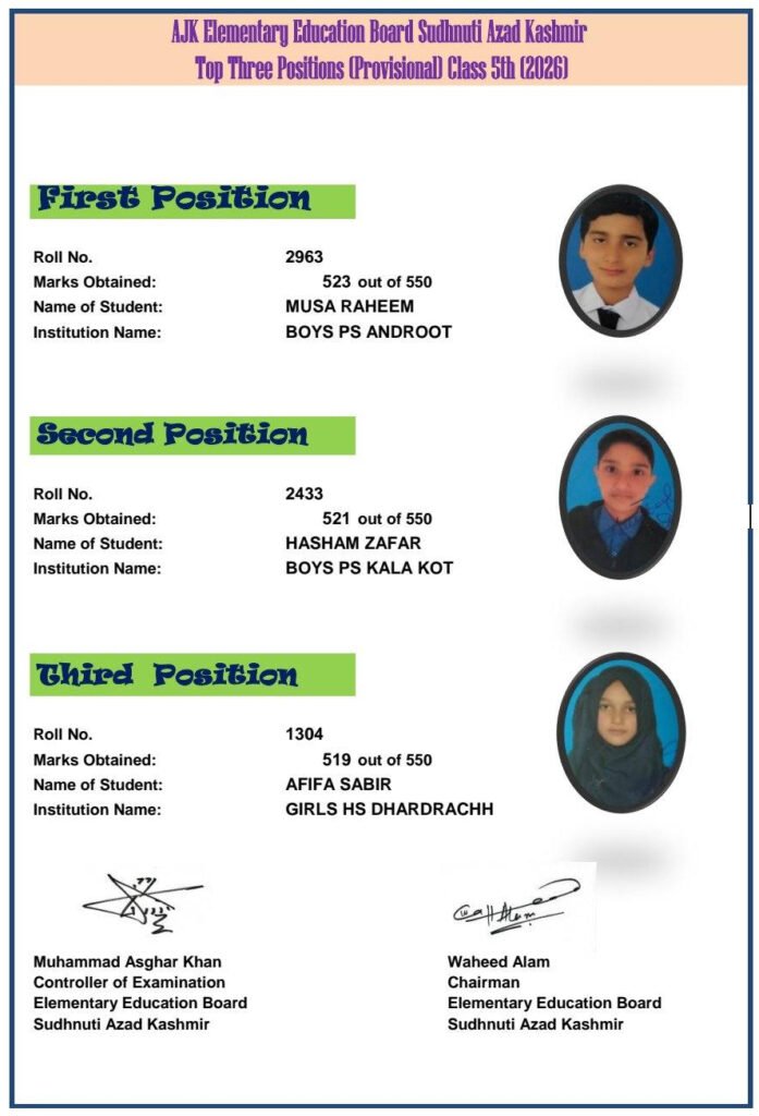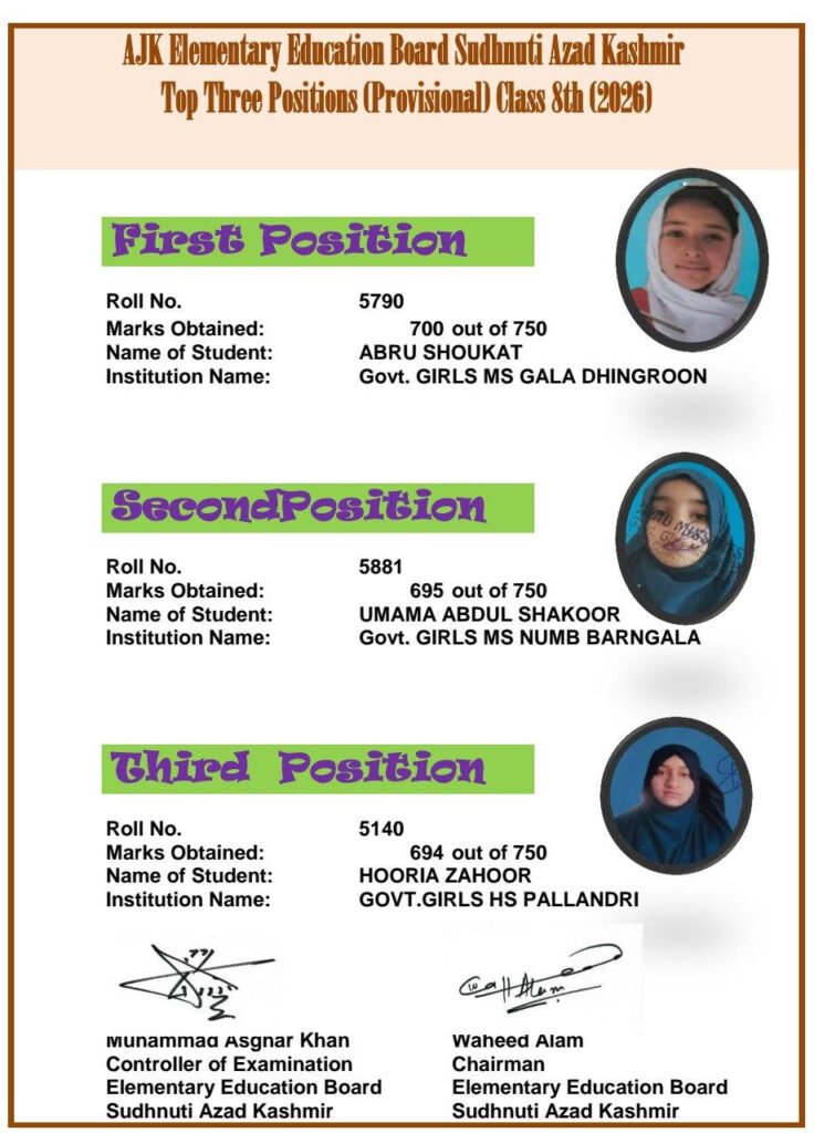 دوسری پوزیشن امامہ عبدالشکور نے 695 نمبر لے کر گرلز مڈل سکول نمب بھرنگلہ کے لیے اعزاز حاصل کیا جبکہ تیسری پوزیشن حوریہ ظہور نے 694 نمبر کے ساتھ گرلز ہائی سکول پلندری کے نام کی۔