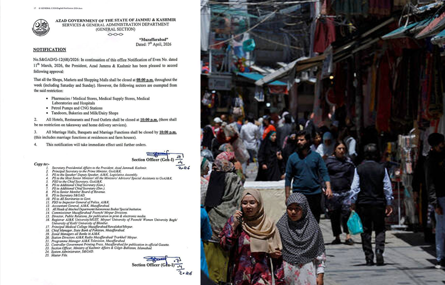حکومتِ آزاد کشمیر نے ریاست بھر میں توانائی کی بچت کے لیے بڑے فیصلے کرتے ہوئے بازاروں اور کاروباری مراکز کے اوقاتِ کار محدود کر دیے ہیں۔ سروسز اینڈ جنرل ایڈمنسٹریشن ڈیپارٹمنٹ کی جانب سے جاری کردہ تازہ ترین نوٹیفیکیشن کے مطابق صدر آزاد جموں و کشمیر نے نئے اقدامات کی منظوری دے دی ہے۔