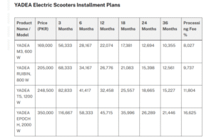 بینک کی جانب سے جاری کردہ پلان میں YADEA کے مقبول ماڈلز شامل کیے گئے ہیں جن کی تفصیل درج ذیل ہے: