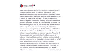 صدر ٹرمپ نے انکشاف کیا کہ ان کی پاکستان کے وزیراعظم شہباز شریف اور فیلڈ مارشل عاصم منیر کے ساتھ گفتگو ہوئی ہے۔ انہوں نے بتایا کہ پاکستانی قیادت کی درخواست پر ہی وہ ایران پر حملے معطل کرنے پر رضامند ہوئے ہیں۔ ان کا ماننا ہے کہ یہ ایک قابل عمل بنیاد ہے جس پر بات چیت ہوگی۔ ایران نے بھی تصدیق کر دی ہے کہ امریکہ کے ساتھ اب دس نکاتی ایجنڈے پر مذاکراتی عمل اسلام آباد میں جمعے سے شروع ہوگا۔