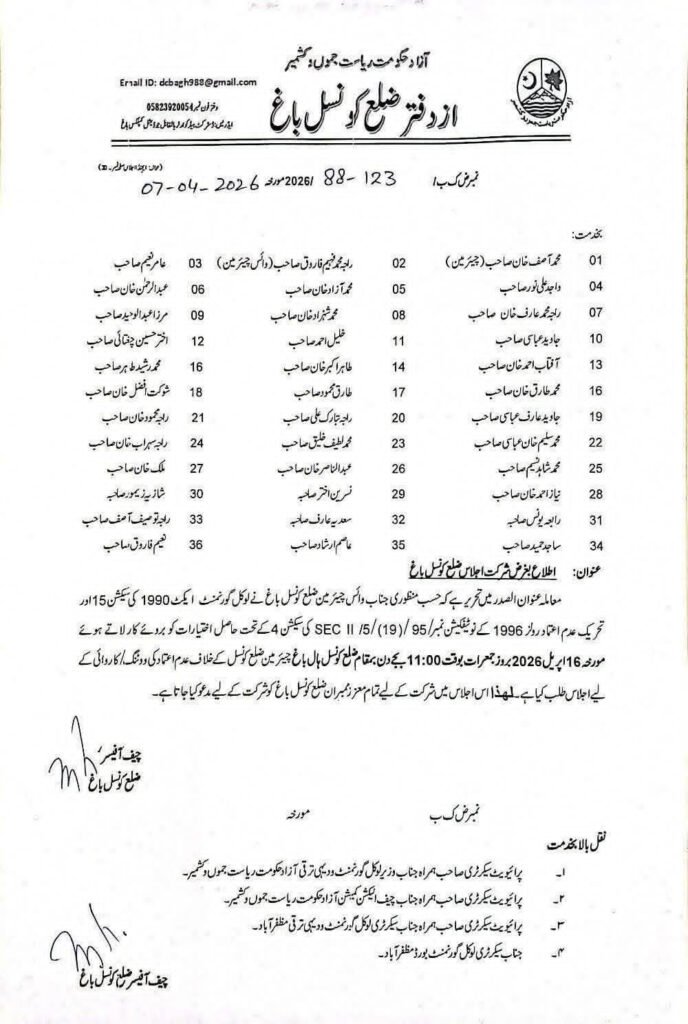 باغ( کشمیر ڈیجیٹل )عدم اعتماد کی تحریک پر رائے شماری کیلئے ضلع کونسل باغ کے ممبران کا اجلاس 16 اپریل کو طلب کر لیا گیا۔