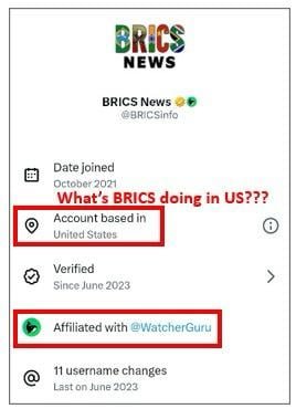 ہینڈل کی تفصیل OSINT سے پتہ چلتا ہے کہBRICSinfo ایک کرپٹو کرنسی پر مبنی X اکاؤنٹWatcherGuru سے وابستہ ہے۔ واچر گرو ایک ایسا فورم ہے جو کرپٹو کرنسی، بٹ کوائن، ایتھریم، ڈی فائی، بلاک چین، فنانس اور متعلقہ موضوعات کے بارے میں حقیقی وقت کی خبروں پر توجہ مرکوز کرتا ہے اور تمام SM پلیٹ فارمز پر موجود ہے۔