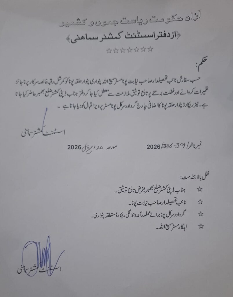 مزید برآں، ریونیو امور کی بروقت انجام دہی کو یقینی بنانے کے لیے حلقہ پٹوار گردآور پرویز اقبال میں عارضی طور پر اضافی چارج دے دیا گیا ہے تاکہ عوامی مسائل میں خلل نہ آئے۔